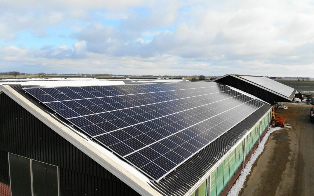 Op dit dak in Tinallinge zijn 1.418 panelen geplaatst. In een tweede fase komen er nog 1.500 panlenen bij. Om de draaglast te verhogen zijn de daken met kipsteunen verstevigd.
